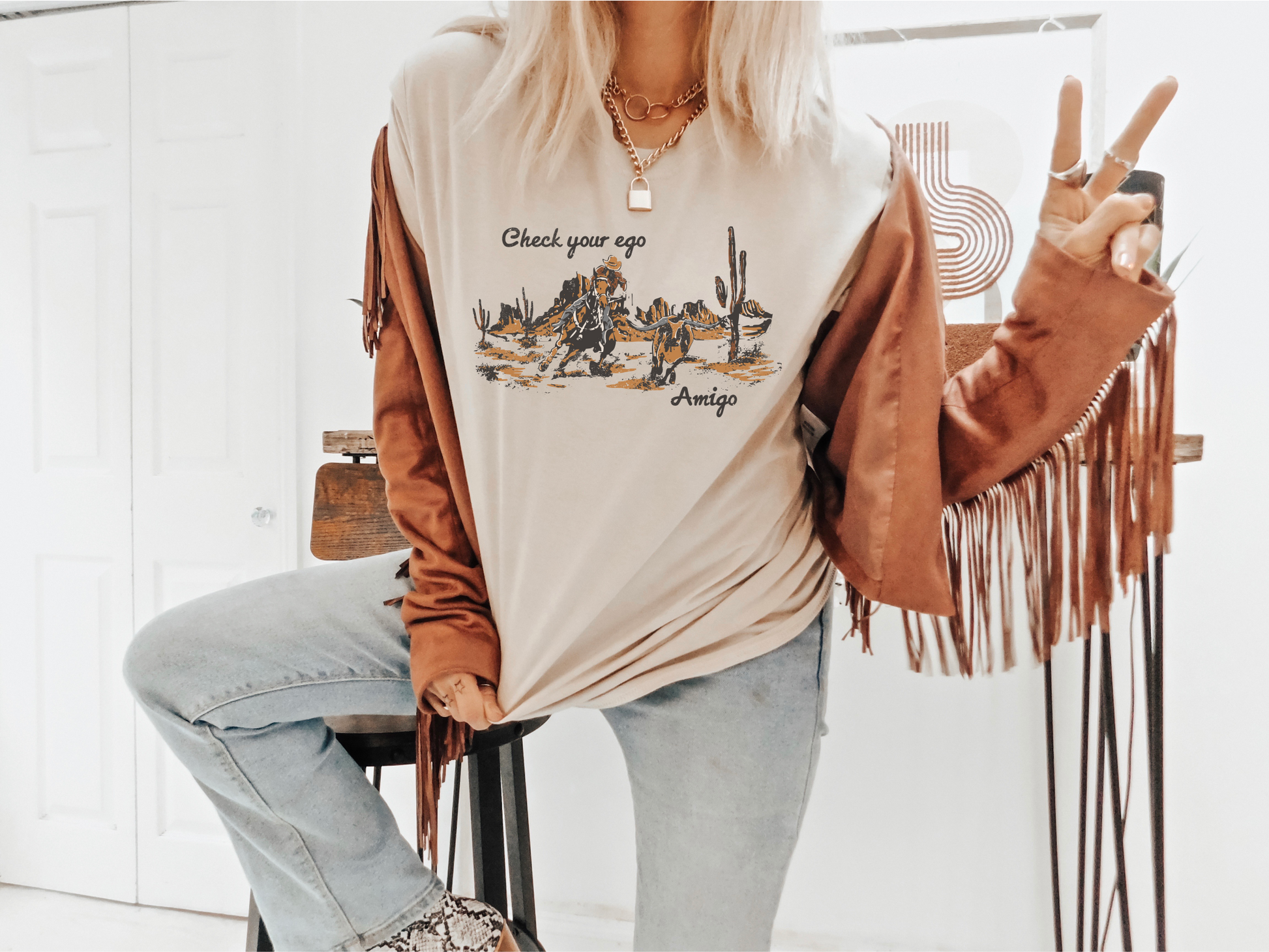 Check Your Ego Amigo! Nothing says umm no thank you like a cowboy with an ego! This cute and trendy western T available in Unisex Bella Canvas xs-3xl in either Natural or White!