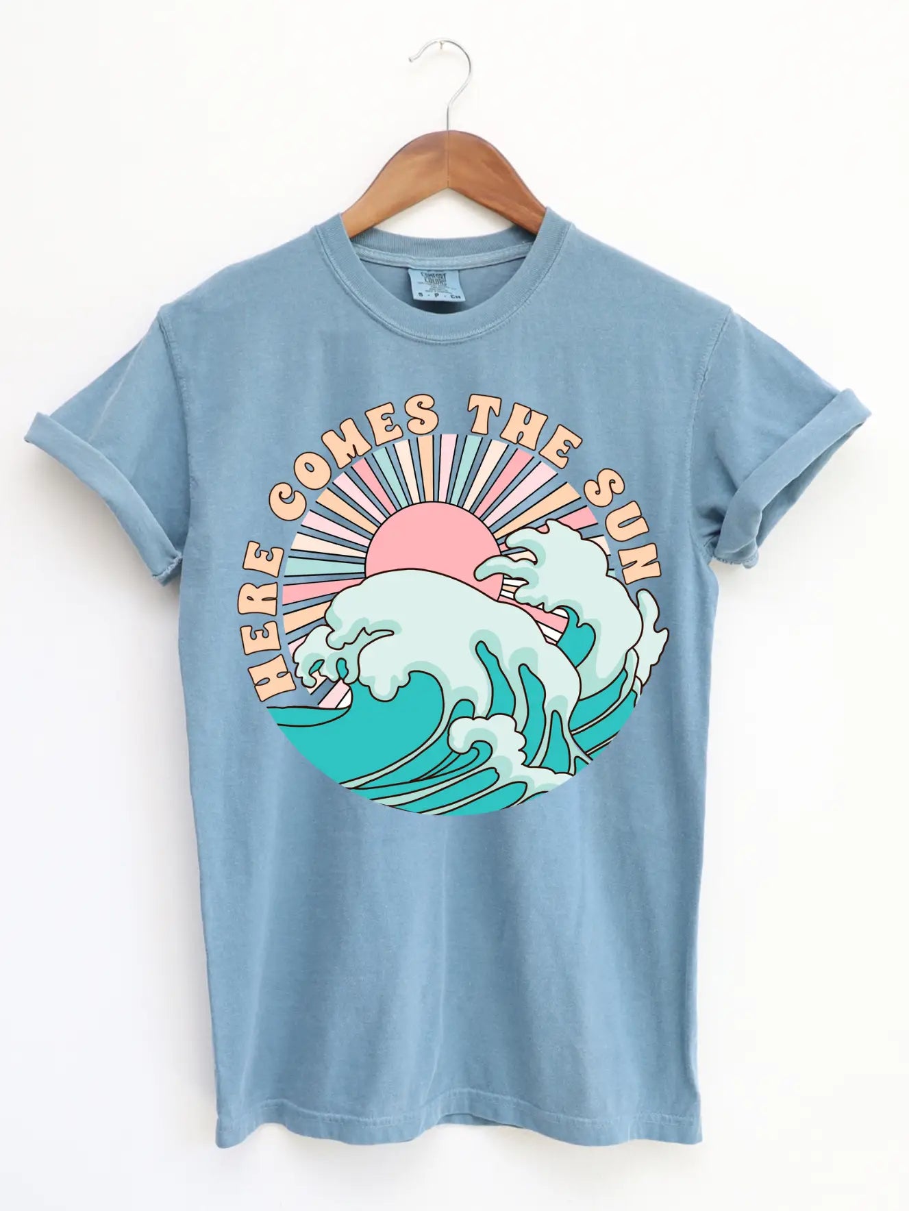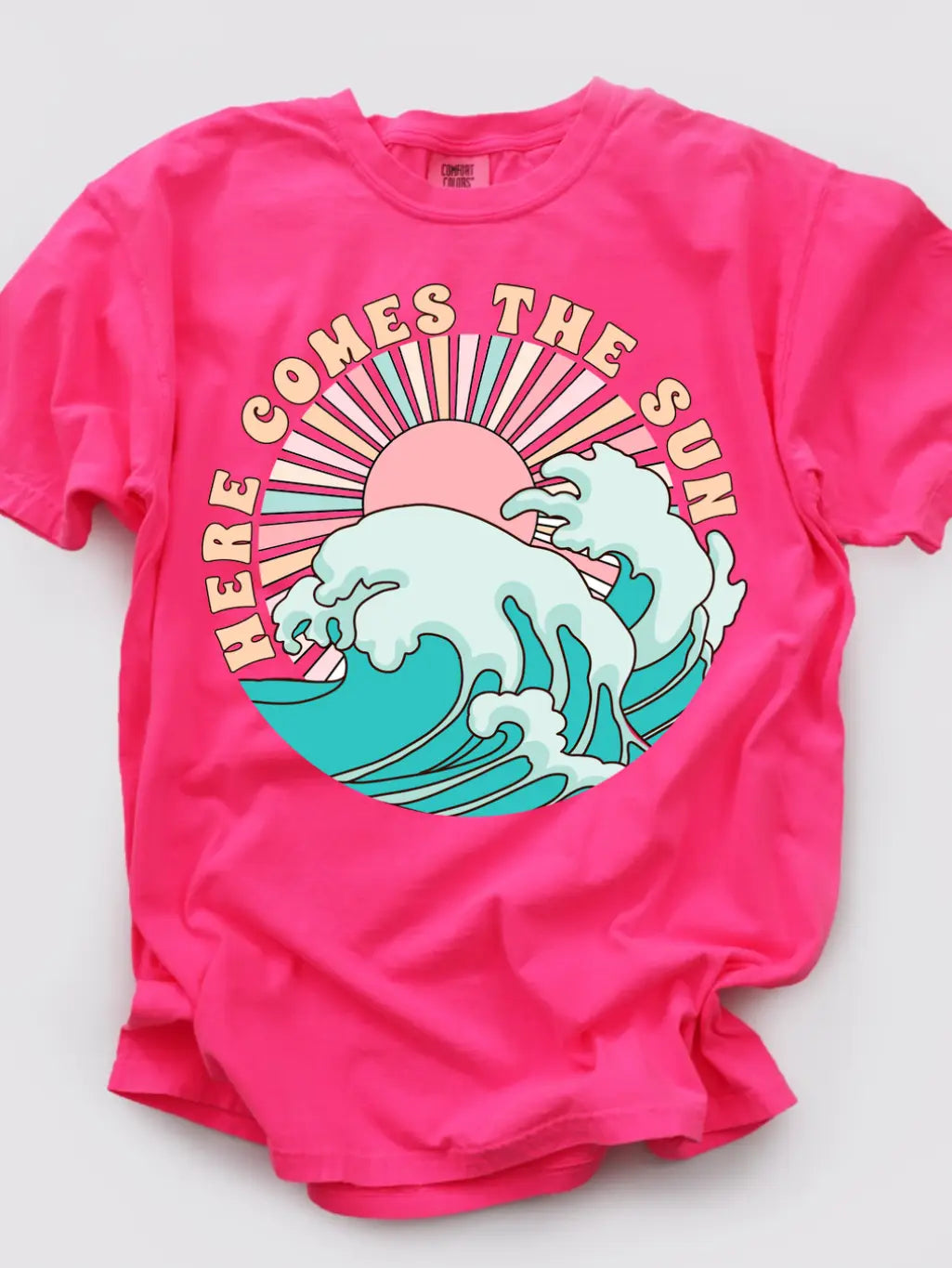 This Here Comes the Sun tee is available in Comfort Colors Neon Pink or Ice Blue. These come in Youth and Adult sizes. Both DTF and shirt are created in our shop in Oklahoma.