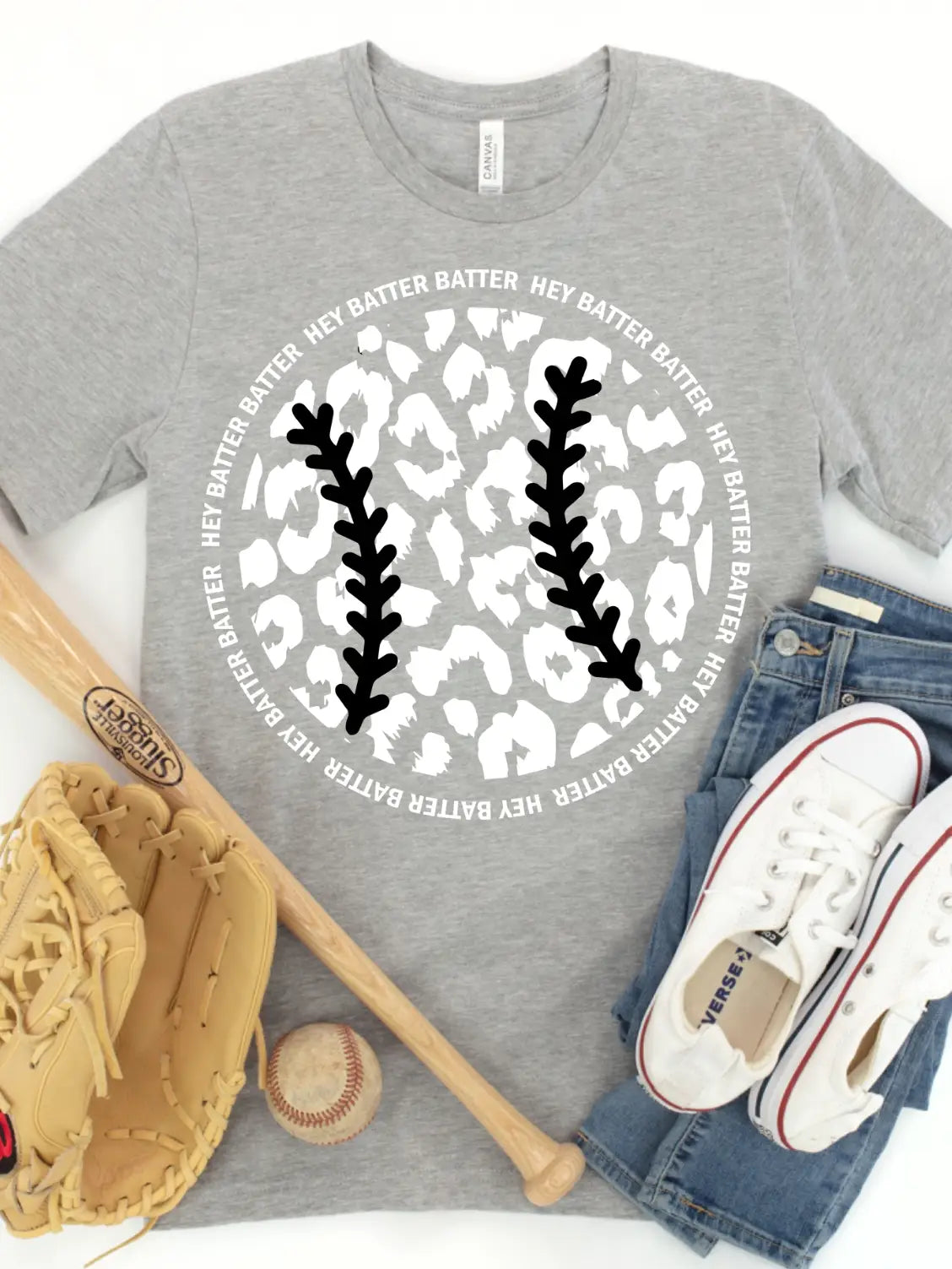 Hey Batter Batter Baseball tee on gray w/ black stitches