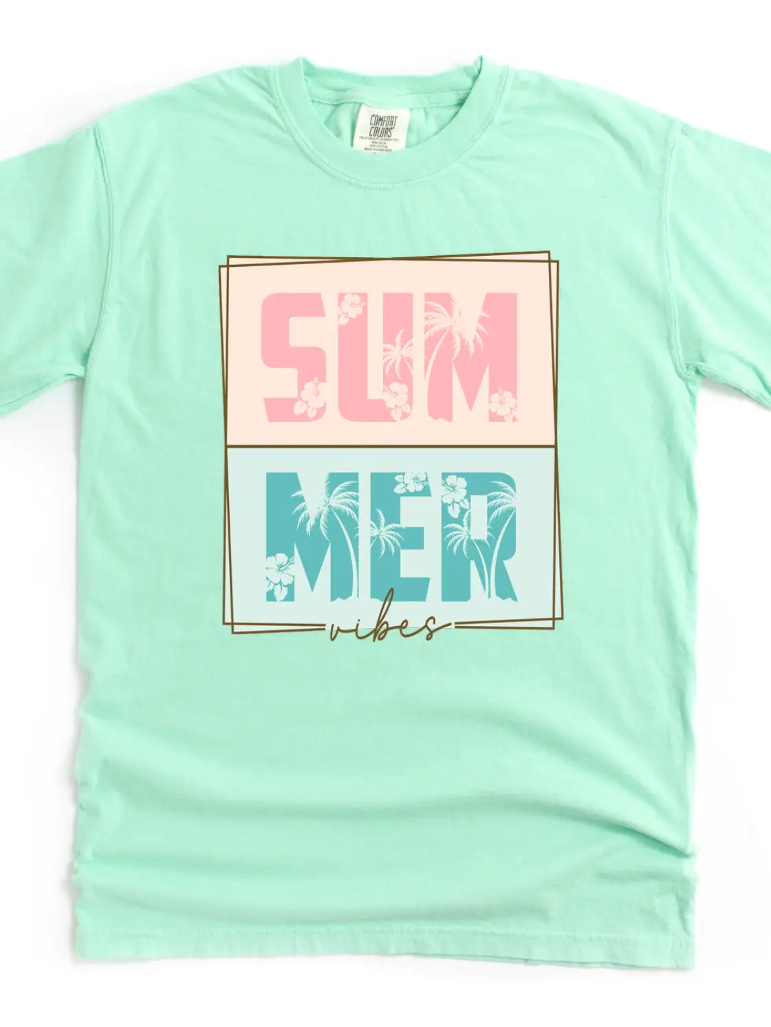 This tee is giving all the Summer Vibes! Printed on a Comfort Colors Island Reef tee. Both DTF and shirt are created in our shop in Oklahoma. Available in youth and adult sizes.