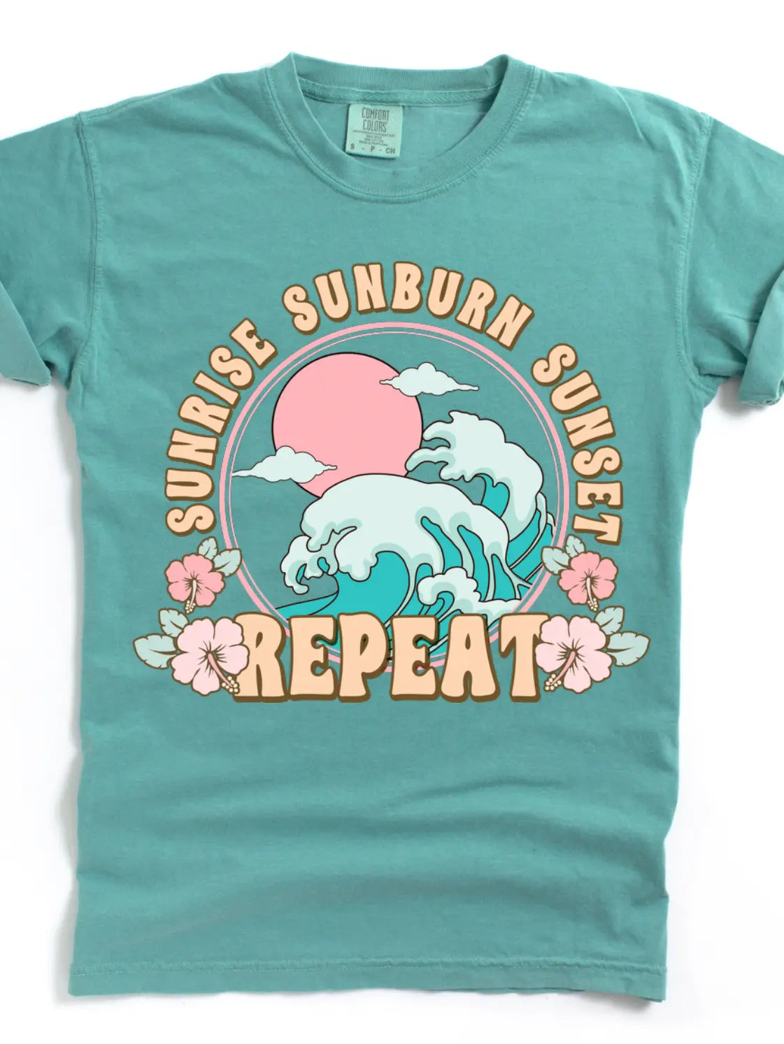 This Sunrise Sunburn Sunset Repeat Tee is great for Spring and Summer! Printed on a Comfort Colors sea foam tee. Both DTF and shirt are created in our shop in Oklahoma. Available in youth and adult sizes.