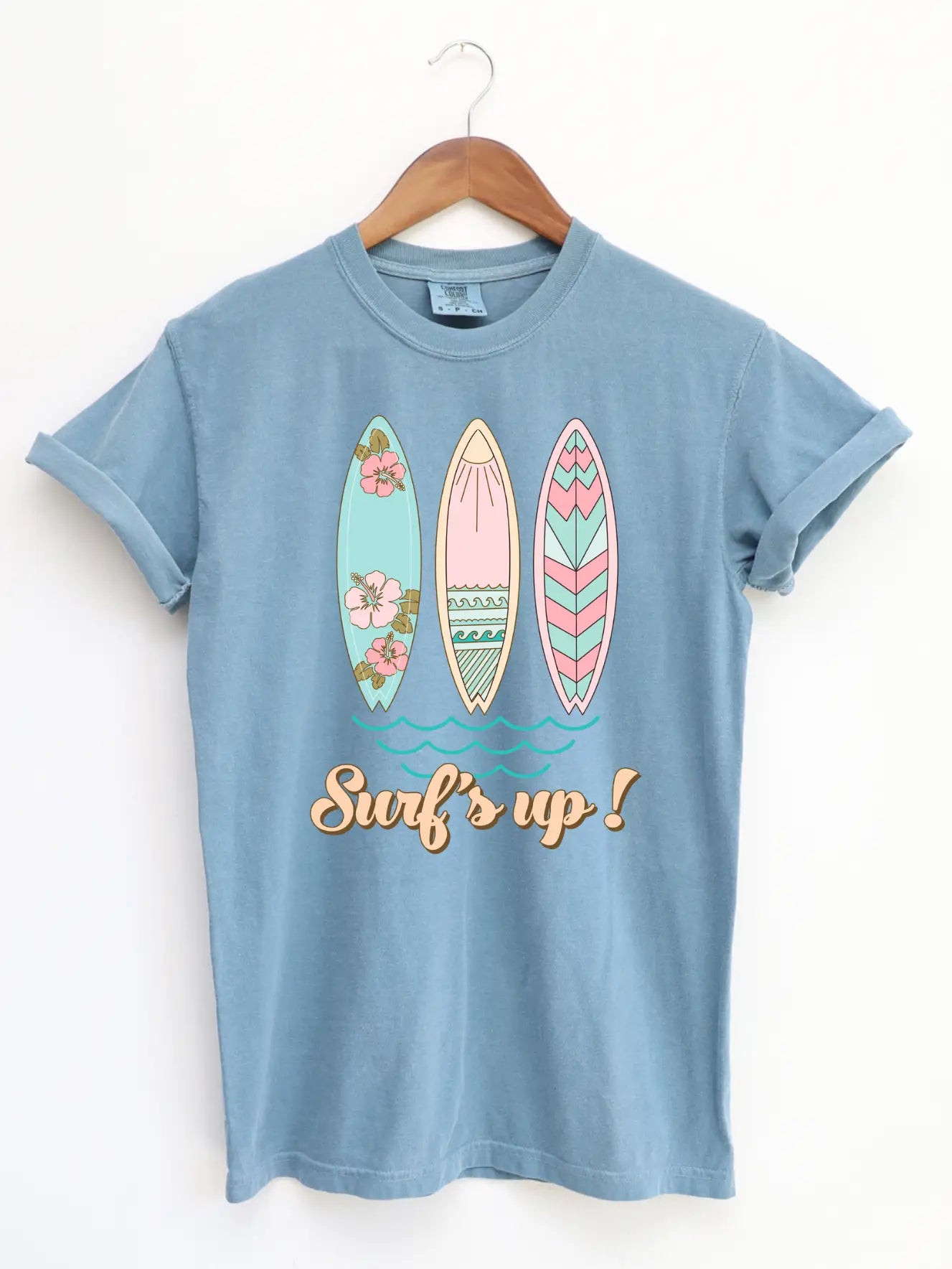 This Surf's Up Tee is great for Spring and Summer! Printed on a Comfort Colors ice blue tee. Both DTF and shirt are created in our shop in Oklahoma. Available in youth and adult sizes.