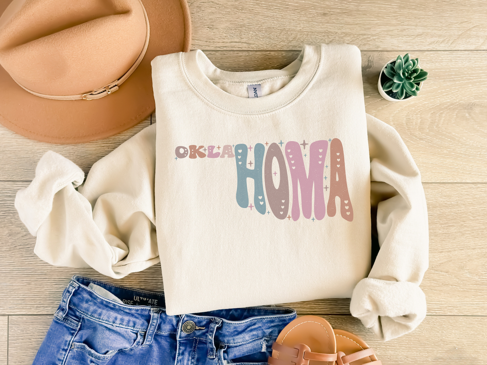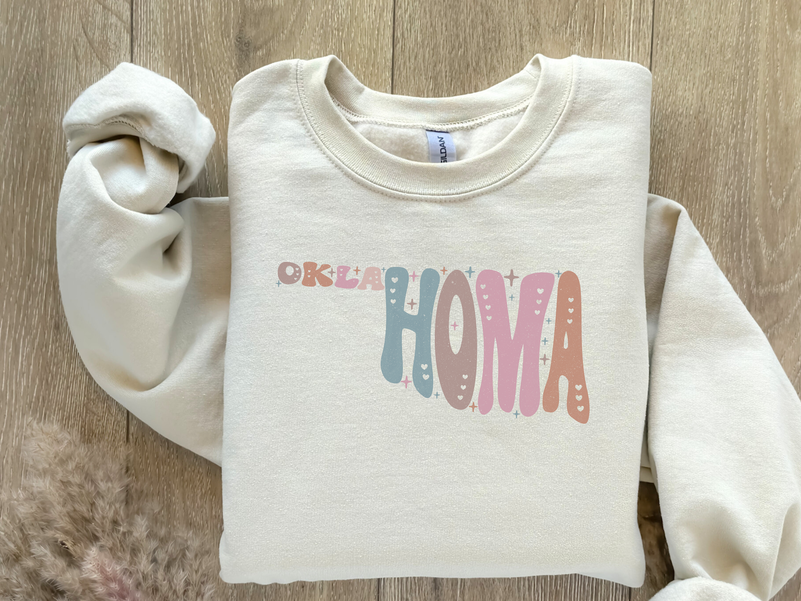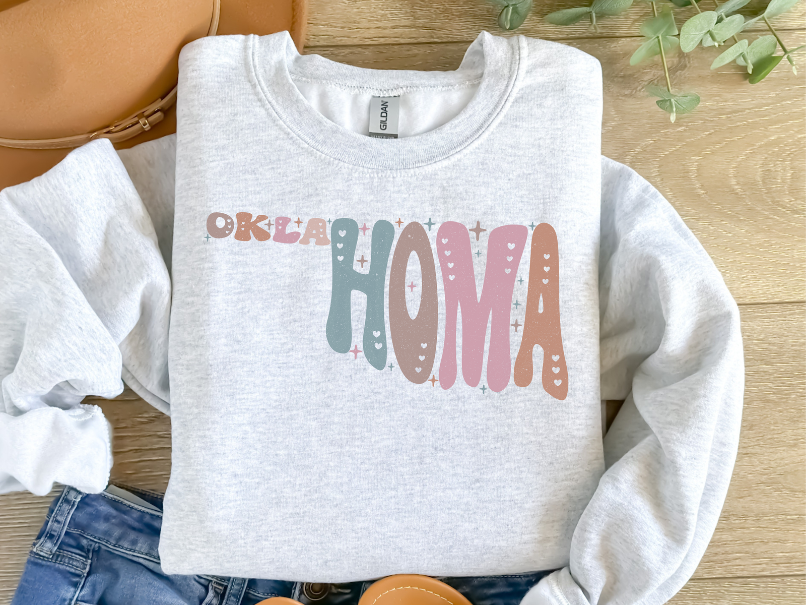 Represent your home state in this vintage look, Oklahoma sweatshirt! Printed on Gildan sand or ash sweatshirt.